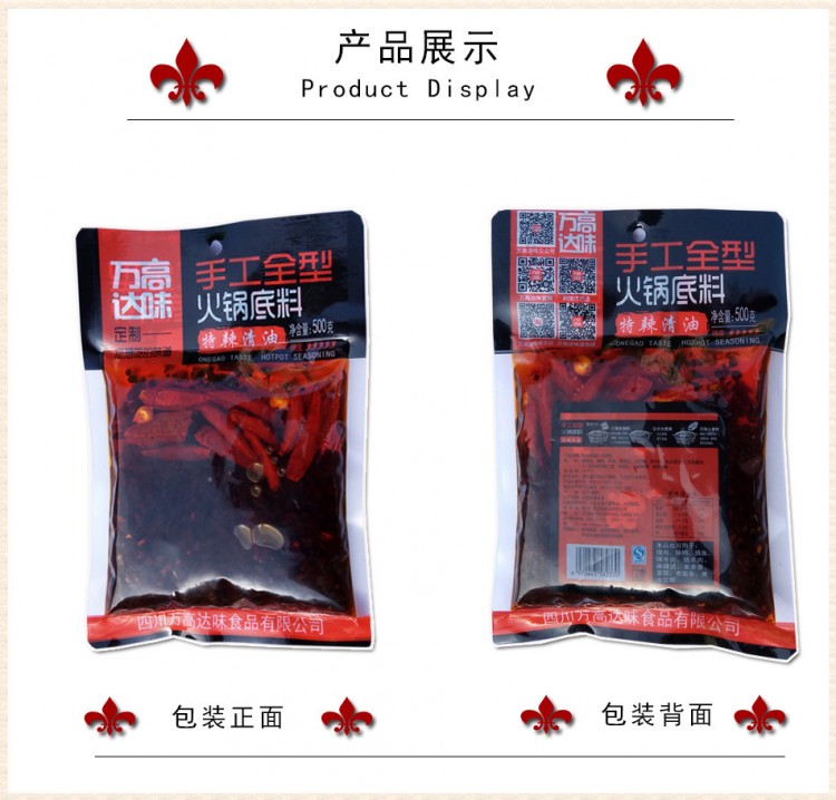 詳細信息 ![]() ![]() ![]() ![]() ![]() 主要經營:公司擁有調味品、方便食品、肉制品、蔬菜制品的生產資質。主要產品覆蓋火鍋底料、辣椒紅油、干鍋香鍋底料、面食調料、粉類調料等標準化小調料包,以及酸辣粉、綿陽米粉、新疆炒米粉、自熱火鍋等方便食品的研發(fā)與定制。" |