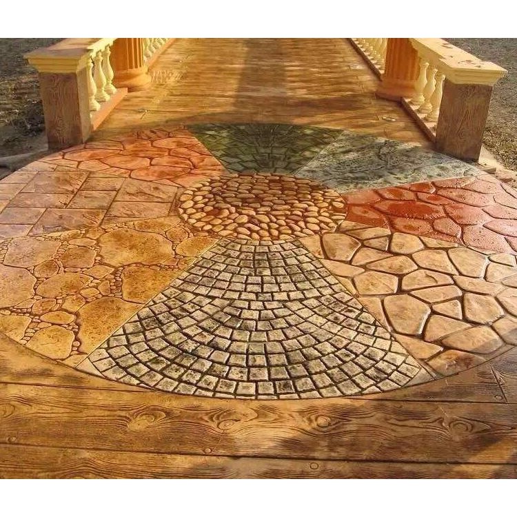 5、使用藝術(shù)地坪模具對(duì)地坪面層進(jìn)行紋理處理。藝術(shù)地坪模具應(yīng)配套使用,首先確定好紋理的分布方向,選好一塊模具放置的位置和角度,然后其它的模具依次緊貼一塊模具放置。彩色混凝土藝術(shù)地坪壓模采用壓模,壓模應(yīng)由技術(shù)較好的人員進(jìn)行作業(yè)以保證壓紋深度一致和模具放置的準(zhǔn)確性。