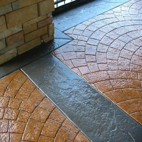 5、使用藝術(shù)地坪模具對(duì)地坪面層進(jìn)行紋理處理。藝術(shù)地坪模具應(yīng)配套使用,首先確定好紋理的分布方向,選好一塊模具放置的位置和角度,然后其它的模具依次緊貼一塊模具放置。彩色混凝土藝術(shù)地坪壓模采用壓模,壓模應(yīng)由技術(shù)較好的人員進(jìn)行作業(yè)以保證壓紋深度一致和模具放置的準(zhǔn)確性。